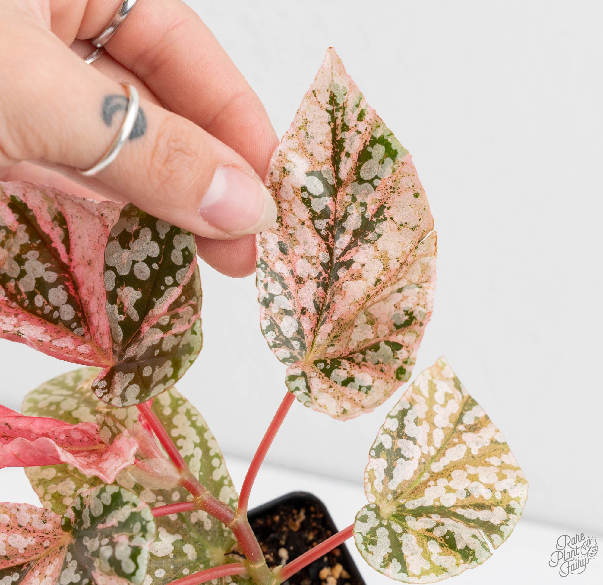 Begonia ‘Snow Capped’ is a variegated selection known for its dense, speckled foliage. Juvenile leaves emerge soft green with delicate silver flecking and subtle pink tones within the leaves, along the veins, and on the undersides, which become more pronounced as the plant matures. Mature leaves develop a rich, medium to deep green base densely adorned with silvery-white spots, creating a “snow-dusted” effect, while the pink highlights add a luminous, layered appearance. The slightly textured, oak-shaped leaves are supported on upright or arching pink stems, giving the plant a bushy, dimensional presence that makes it a standout in any collection.