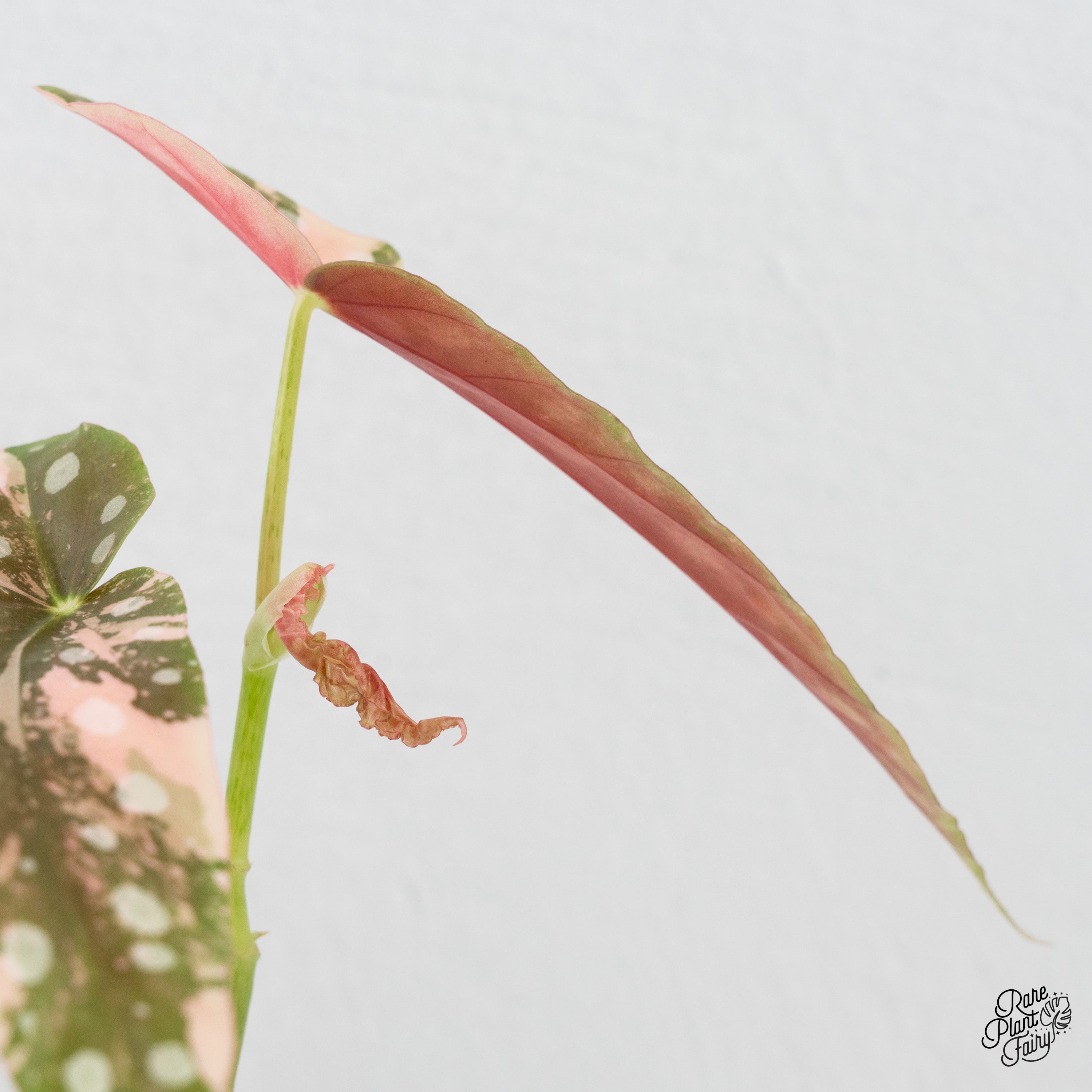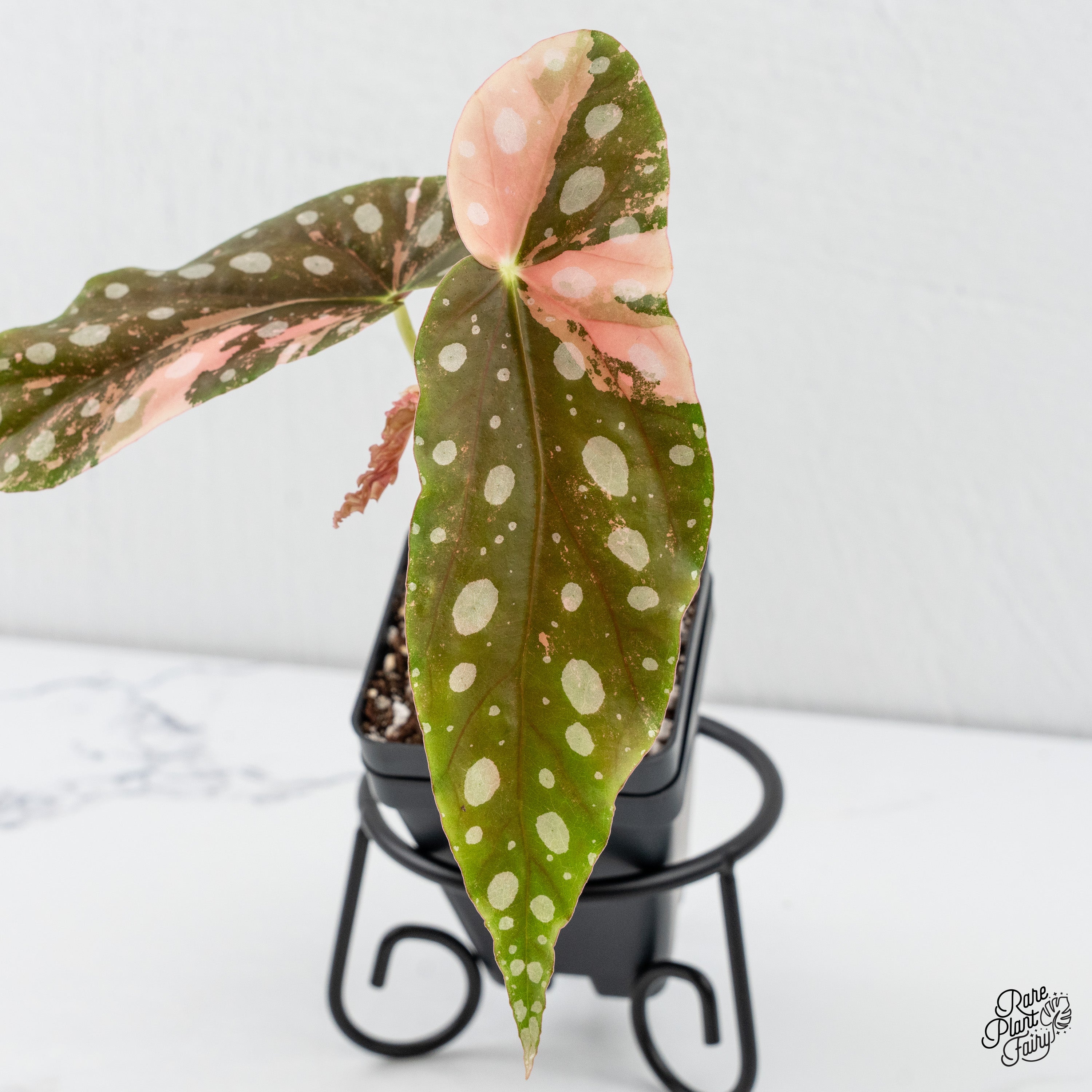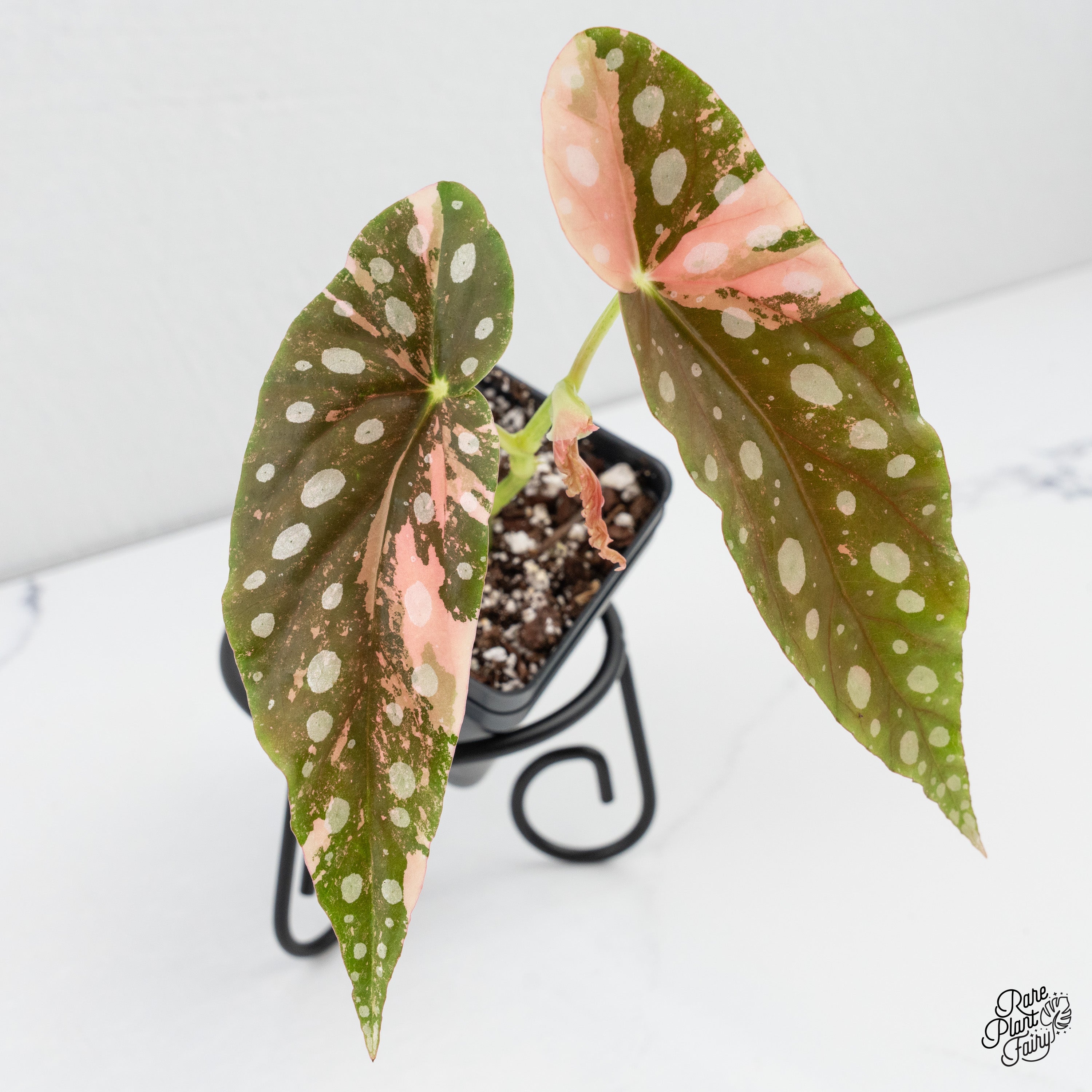 Begonia maculata pink variegated is a cultivated form of Begonia maculata that was once considered extremely rare and elusive, with some collectors believing it did not exist at all. The elongated, wing-shaped leaves display the species’ characteristic green base and silver spotting, overlaid with soft pink to blush-toned variegation caused by reduced chlorophyll. Leaf undersides retain a reddish hue, adding contrast as the plant matures. This begonia exhibits an upright, cane-type growth habit and grows best under high humidity, bright, indirect light, and evenly moist, well-draining soil. Adequate air circulation is important for maintaining foliage health and stable coloration.