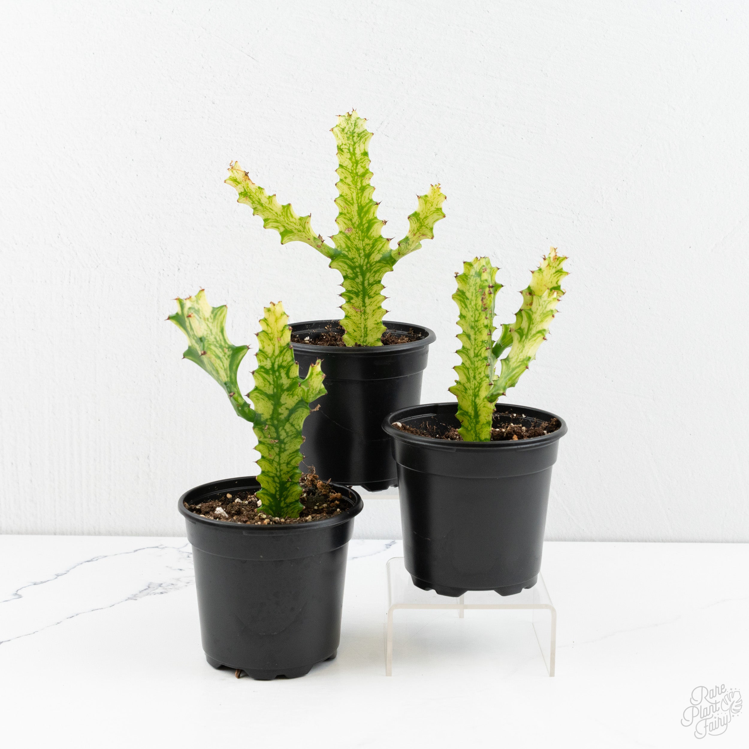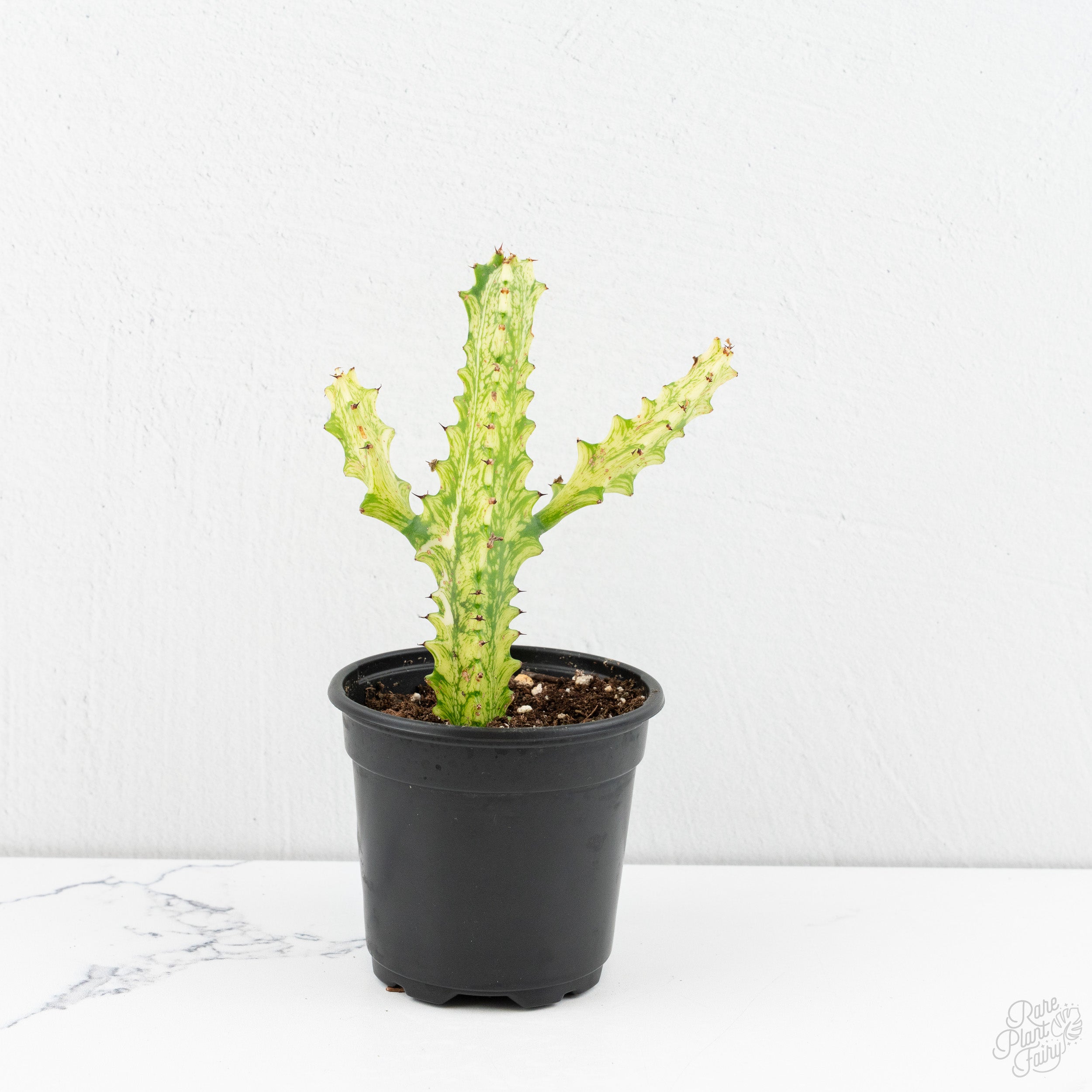 Euphorbia trigona 'Variegata', also known as the Variegated African Milk Tree, is a columnar succulent with upright, triangular stems edged with small thorns. What makes this variety special is its stunning variegation. Creamy yellow and lime green marbling runs across the stems with flashes of deeper green throughout. Each plant is unique in its patterning, making every one a true collector's piece. Bold in form and eye-catching in color, this Euphorbia is a standout addition to any collection. Drought-tolerant and low-maintenance, it thrives in bright, indirect light or full sun. Plant in well-draining soil and water sparingly, allowing the soil to dry completely between waterings. Grower's choice, you'll receive a plant similar in size and variegation to the one pictured.